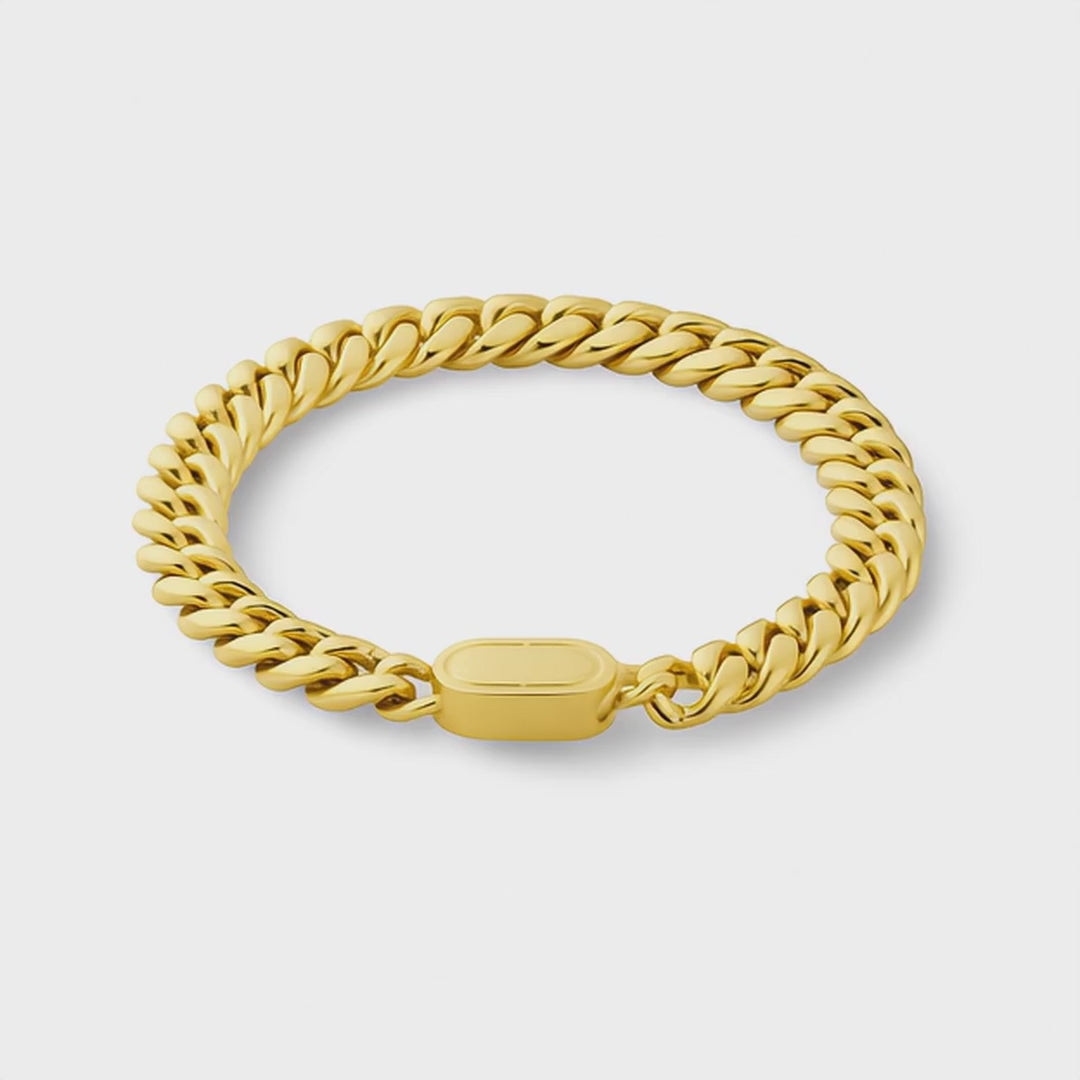 This gold Cuban bracelet with its unique clasp is a must-have. Wear it alone or layer it with other jewelry—it always makes a stylish impression!