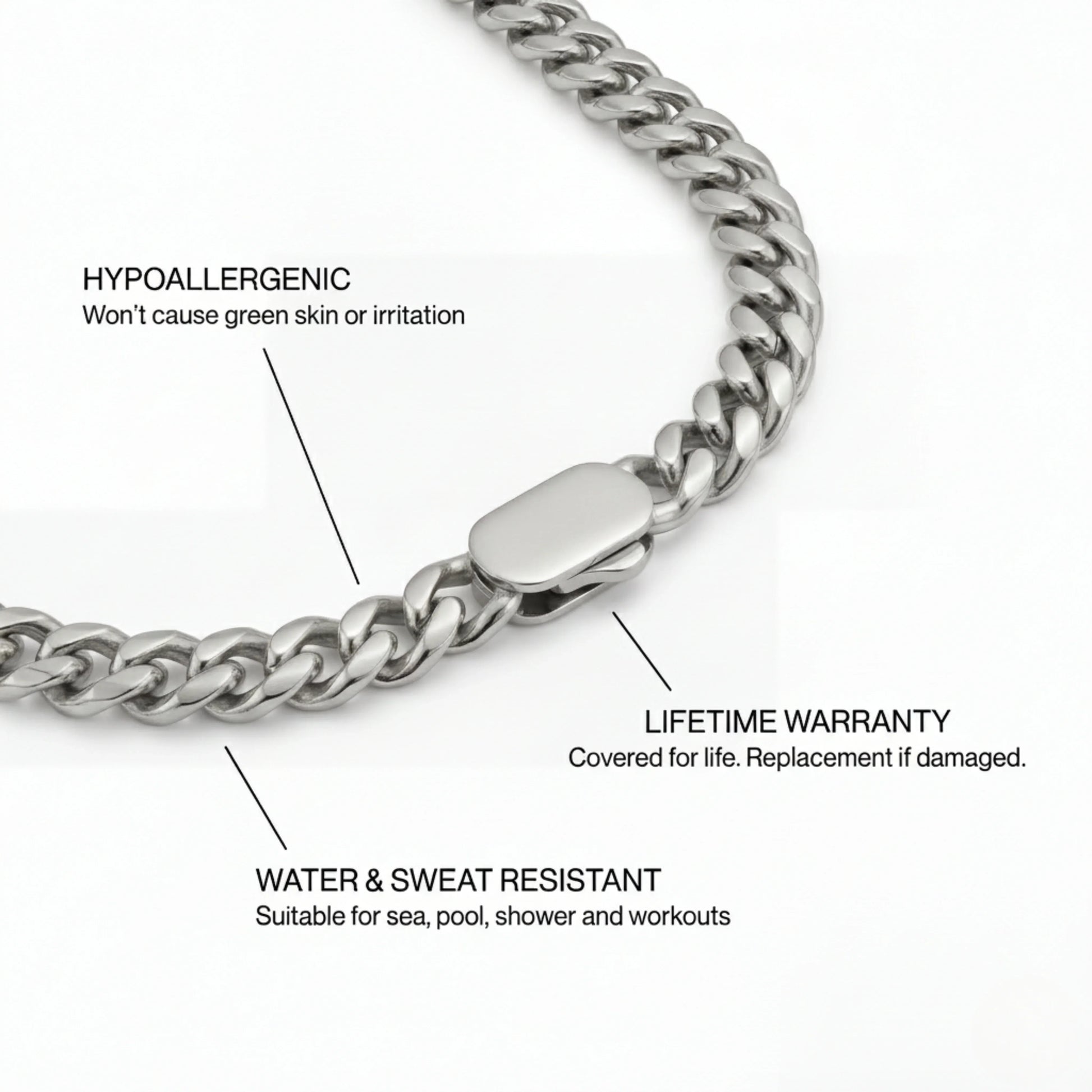 This silver Cuban chain with its unique clasp is a must-have. Wear it alone or layer it with other jewelry for a stylish look!