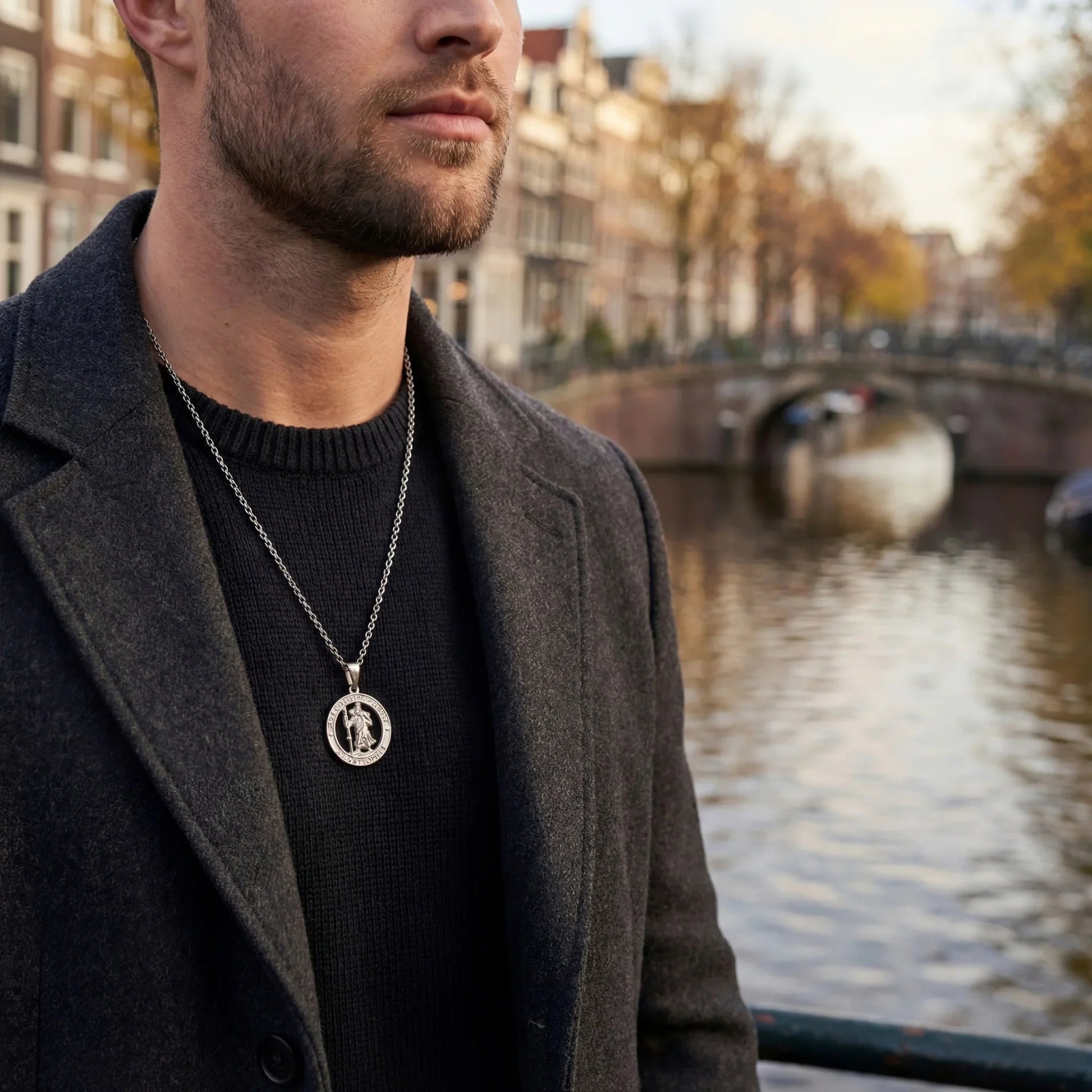 Protected on the go, worn with pride. This pendant features Saint Christopher, the patron saint of travelers, symbolizing protection, strength, and a safe journey. A classic design with deep meaning, available in gold or silver.